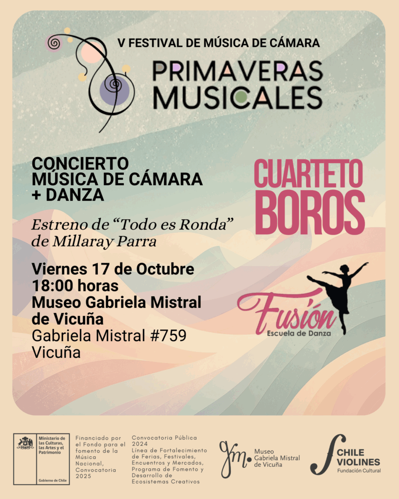 El viernes 17 de octubre, a las 18:00 horas, el Museo Gabriela Mistral de Vicuña abrirá el festival con la presentación del Cuarteto Boros, que interpretará la obra comisionada a la compositora Millaray Parra, en un concierto acompañado por la propuesta escénica de la Escuela de Danza Fusión.