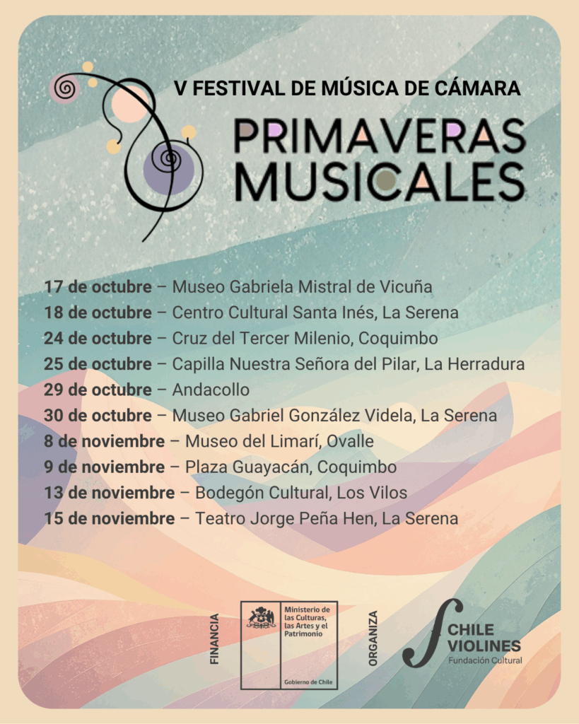 Entre octubre y noviembre de 2025 se desarrollará en la Región de Coquimbo la quinta edición del Festival Primaveras Musicales, encuentro de música de cámara organizado por Fundación Chile Violines con financiamiento del Fondo para el Fomento de la Música Nacional. Este año, el festival amplía su alcance territorial y programático, combinando conciertos en espacios culturales emblemáticos, estrenos de nuevas obras y una feria interdisciplinaria que acercará las artes a públicos diversos.