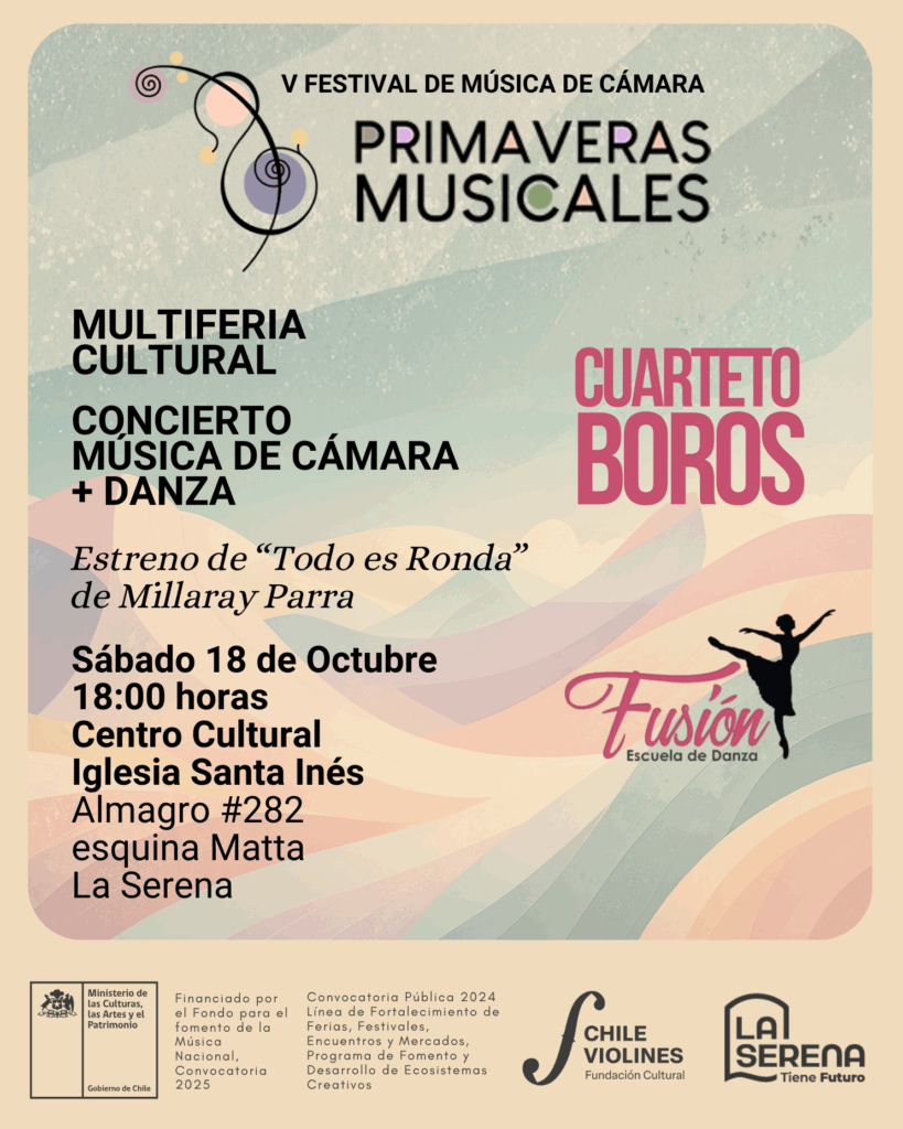 La jornada continuará el sábado 18 de octubre, también con el Cuarteto Boros en el Centro Cultural Santa Inés de La Serena, nuevamente en diálogo con Danza Fusión. Además se desarrollará una feria de artes integradas, con exponentes destacados de diversos ámbitos culturales y artísticos, configurando una experiencia más amplia y multidisciplinaria