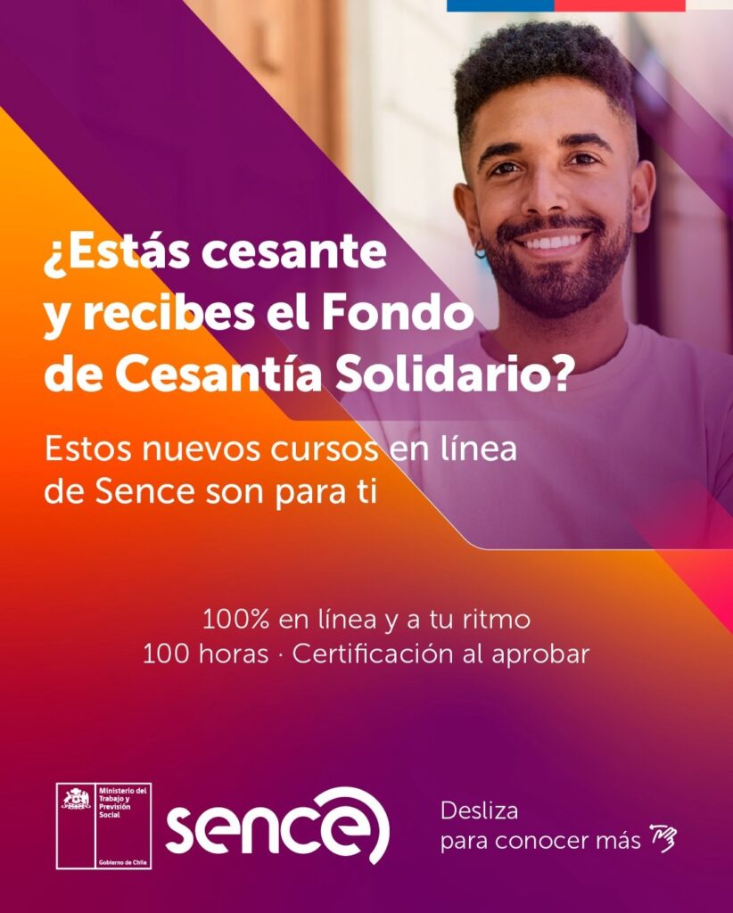 El Servicio Nacional de Capacitación y Empleo, SENCE, informó la apertura de postulaciones a nuevos cursos gratuitos en modalidad en línea, dirigidos a personas cesantes beneficiarias del Fondo de Cesantía Solidario (FCS), con el objetivo de fortalecer sus competencias y apoyar su reinserción en el mercado laboral.