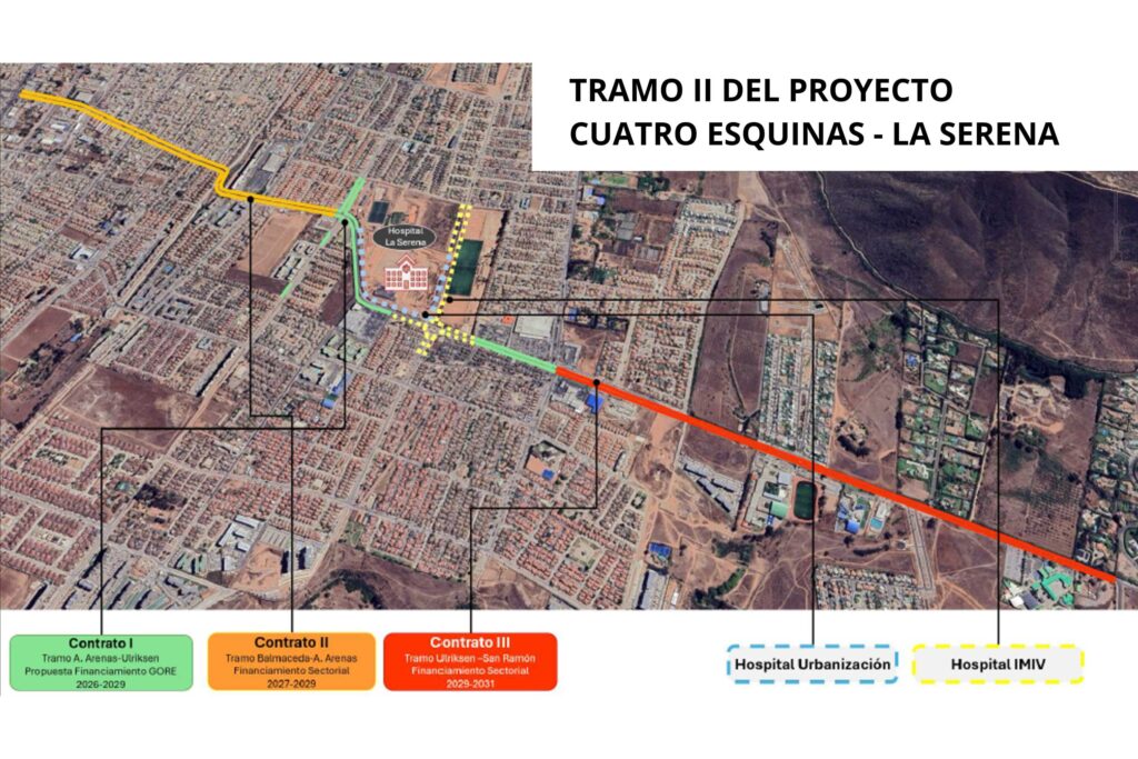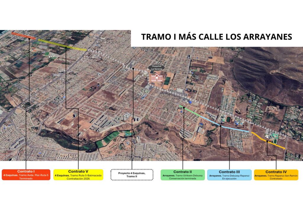 A paso firme avanza el proyecto de mejoramiento de Avenida Cuatro Esquinas de La Serena, el cual abarcará 6 kilómetros en su total, con una inversión pública superior a $72.000 millones. En la actualidad se está desarrollando el Tramo 1, específicamente la nueva vía Los Arrayanes entre Claude Debussy y Camino San Ramón, tras culminar las etapas Avenida del Mar – Ruta 5 y Ulriksen – Debussy.