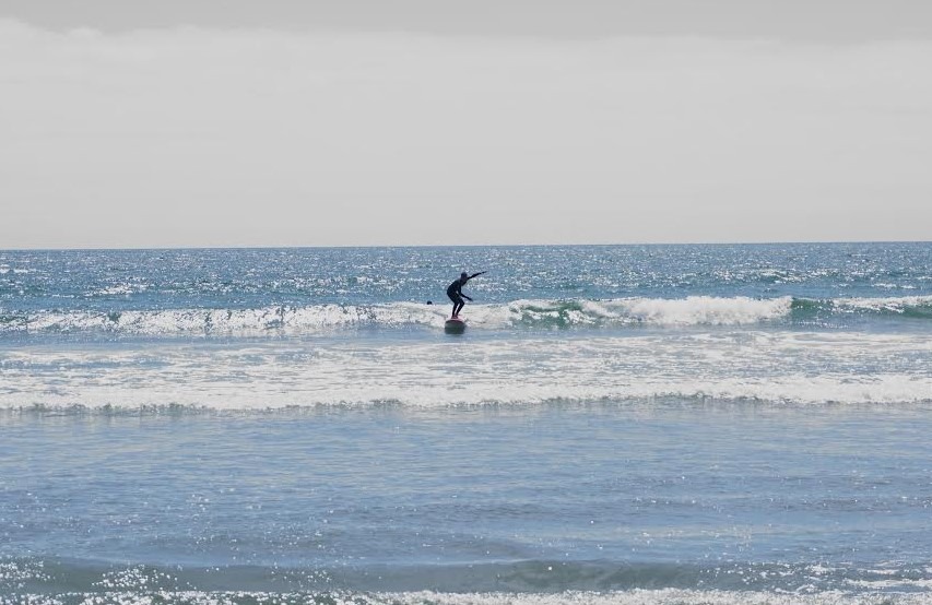 técnicas del surf, siempre guiado por un instructor especializado. Desde su primer ingreso al agua destacó la motivación, el entusiasmo y una conexión genuina con la actividad, que se extendió por más de dos horas y permitió reforzar habilidades socioemocionales claves en su proceso de reinserción.