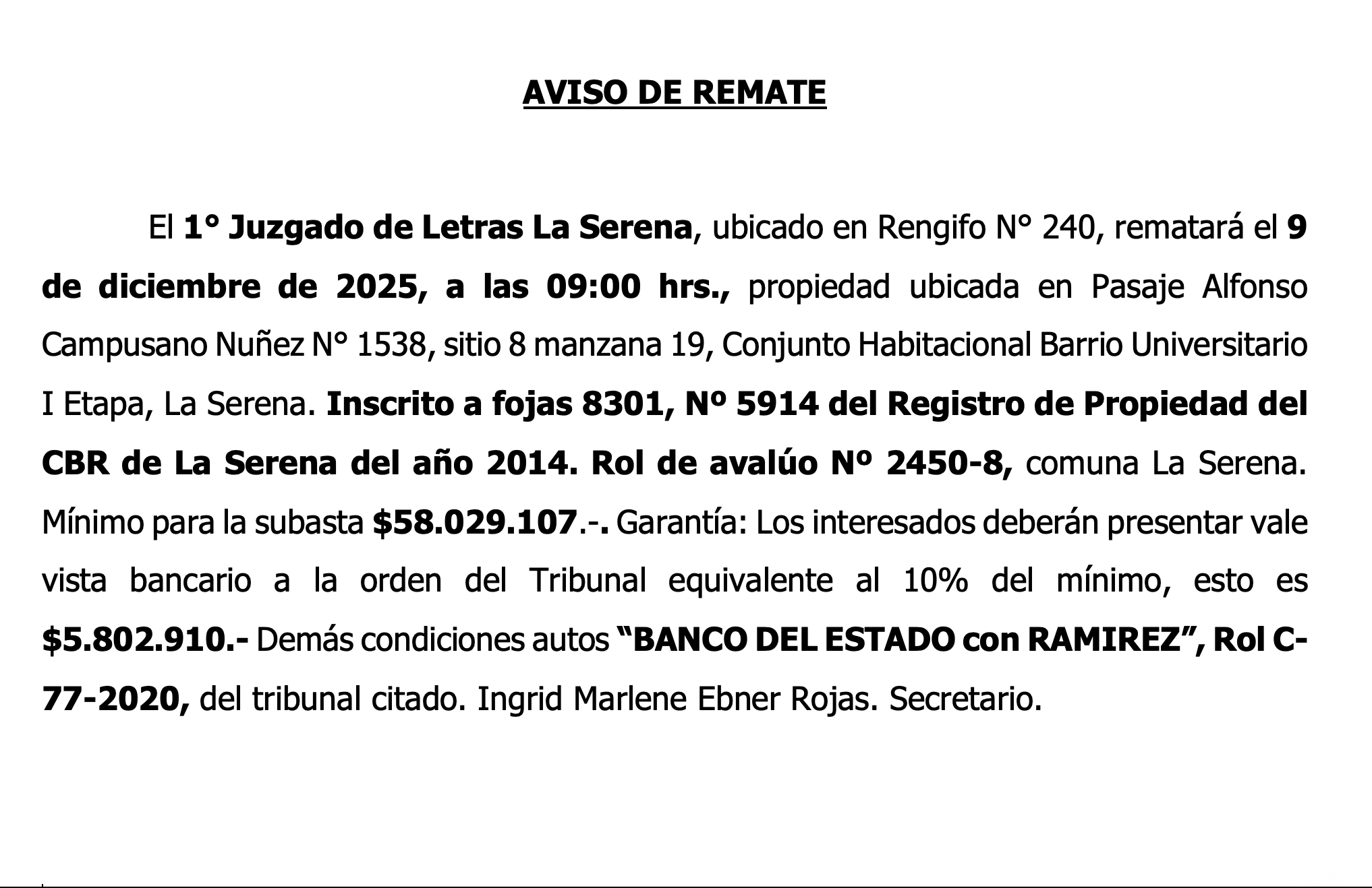 Remate. Propiedad en Pasaje Alfonso Campusano Nuñez N° 1538, sitio 8 manzana 19, Conjunto Habitacional Barrio Universitario I Etapa, La Serena.