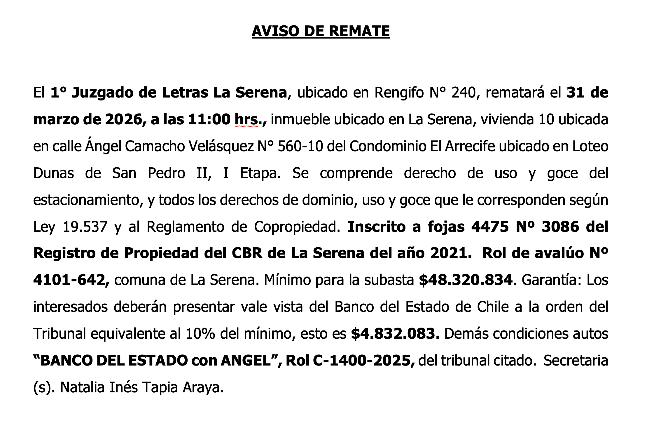 Remate. Vivienda 10 ubicada en calle Ángel Camacho Velásquez N° 560-10, Condominio El Arrecife, Loteo Dunas de San Pedro II, I Etapa. La Serena.