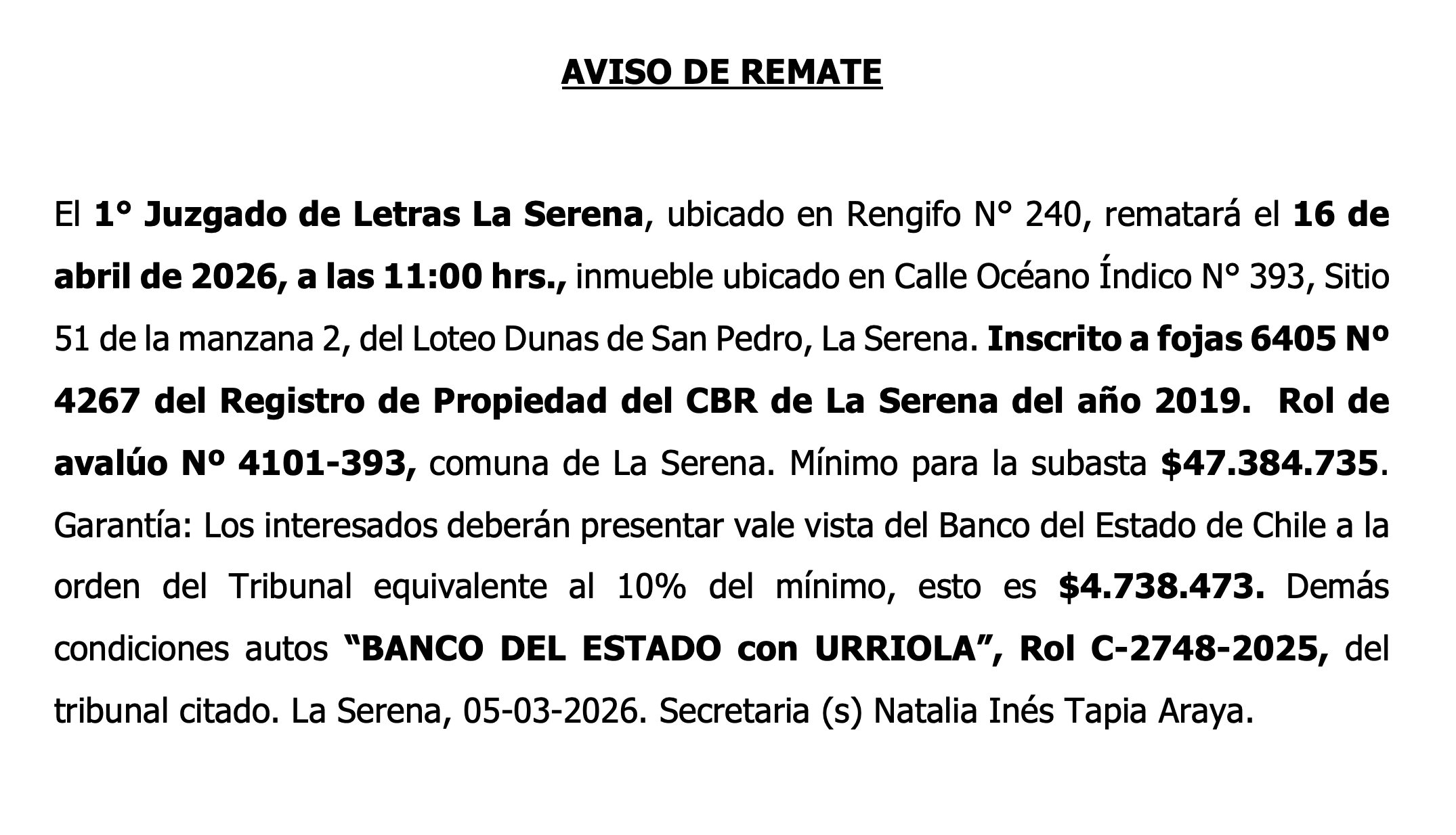 Remate. Inmueble ubicado en calle Océano Índico 393, sitio 51 de la manzana 2, Loteo Dunas de San Pedro, La Serena