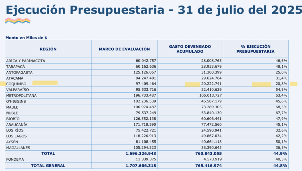La Subdere liberó el gasto que han realizado los distintos gobiernos regionales del país al mes de julio 2025, con el presupuesto asignado a cada zona. En el caso de la región de Coquimbo, por sexta vez consecutiva, logra el último lugar nacional teniendo un promedio de 3.0% en gasto mensual. Se toma de febrero a julio ya que en enero no hubo presupuesto traspasado desde el Ejecutivo.
