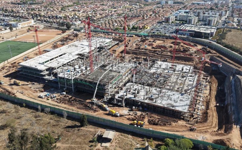 primeras excavaciones para la habilitación de plataformas y accesos principales. Hasta el momento, la edificación ha requerido 35.000 m³ de hormigón y 4.000.000 kg de acero, destinados a la ejecución de radieres, muros estructurales, columnas, vigas y losas.