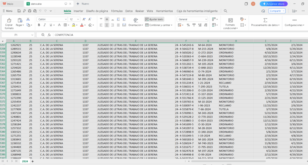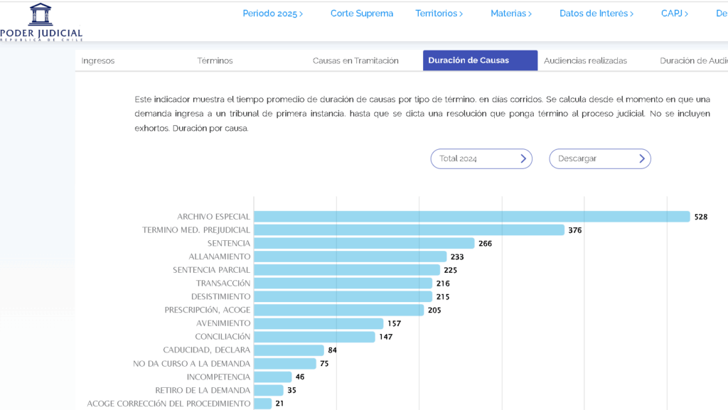 “Se solicita informar al requirente que los datos estadísticos disponibles de los Juzgados de la jurisdicción de la Serena —tales como ingresos, términos, audiencias de causas laborales y de cobranza— correspondientes al periodo comprendido entre enero de 2015 y junio de 2025, puede ser consultada en la sección “Descargas” de la plataforma de datos abiertos denominada “Poder Judicial en Números”, accesible en el siguiente enlace: https://numeros.pjud.cl/Descargas, bajo los apartados “Cobranza” y “Laboral”. Esta información se actualiza semestralmente y permite descargar los registros en diversos formatos”.